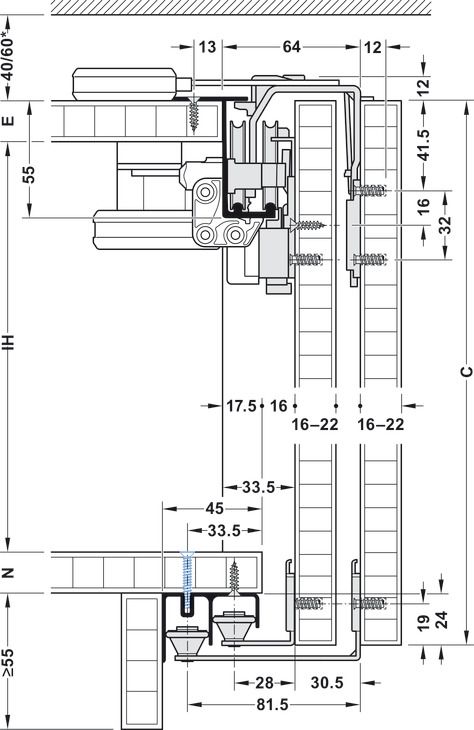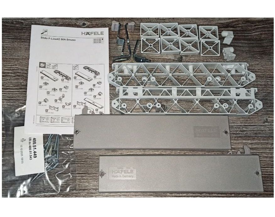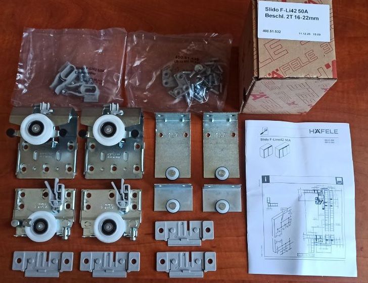 Фурнітура для розсувних дверей, Häfele Slido F-Line42 50A, Для дерев'яних розсувних дверей, передня панель, для дверного полотна вагою до 50 кг, передня панель, для 2 дверних стулок, з механізмом плавного закриття з одного боку, товщина дверного полотна 16–22 мм, 400.51.562 складається (400.51.532 + 400.51.543)
