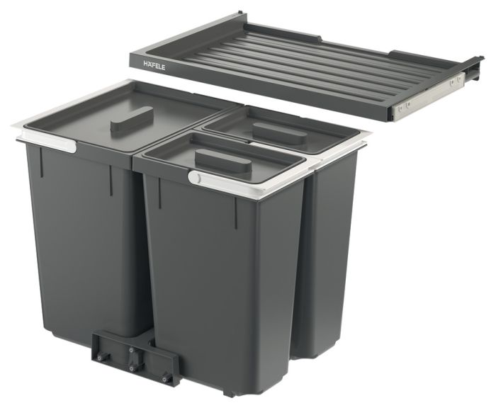 Система розділення сміття Hafele, контейнер для сміття з трьома відділеннями, 1 x 13 і 2 x 10 літрів, Hafele| Для шафи шириною: 500 мм, монтажна висота: 367 мм, Основна висувна полиця: Направляюча шина, один висувний, (501.91.421)