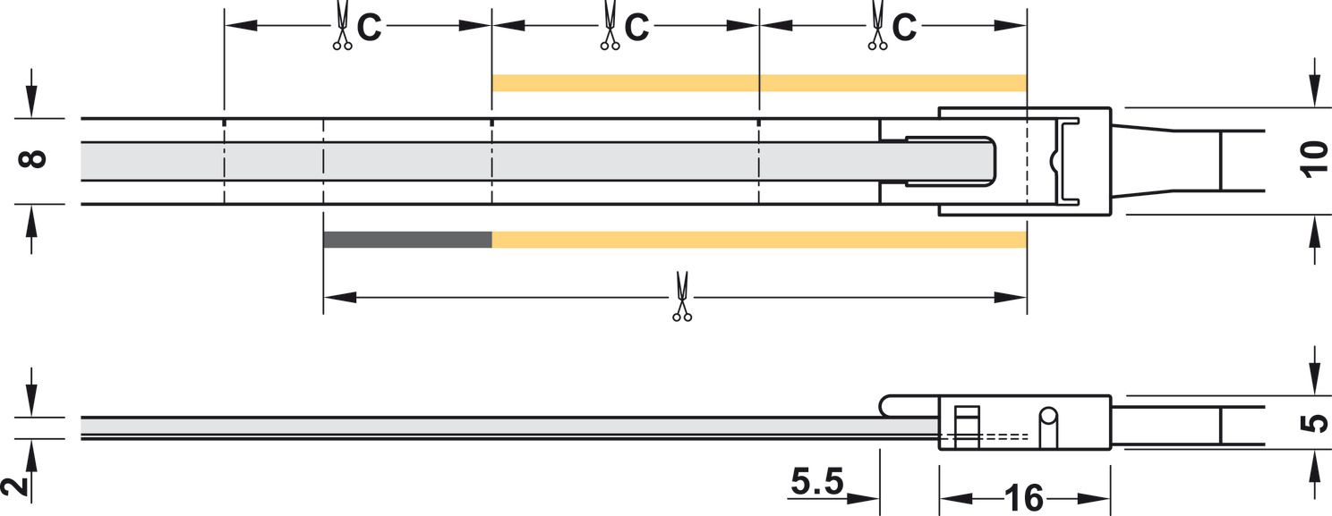Світлодіодна стрічка, COB, Hafele Loox5 LED 3107, 24 В, 8 мм, 2-контактний (2-провідна технологія Tunable White), 2 x 320 світлодіодів/м, 9,6 Вт/м, IP20, Від теплого білого до холодного білого 2700 K–5000 K, 5 м, клас енергоефективності F, 833.76.531