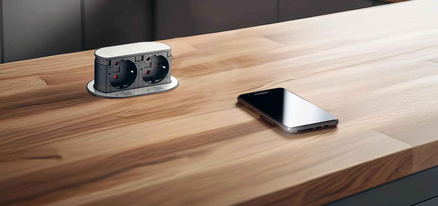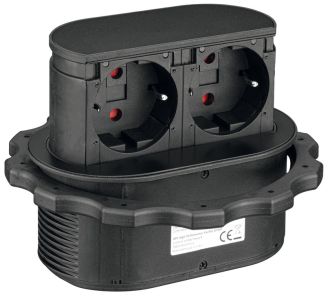 Розетковий елемент, висувний,що опускається, 230 В, для встановлення над шухлядою, 2 x розетки Schuko F (DE), чорна кришка, 820.52.731